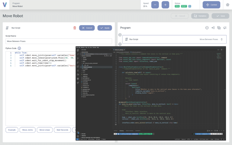 Create functions for an ecosystem and your own applications. Seamlessly integrate the voraus.pioneer into the voraus.operator or use it as a plugin in your preferred programming environment. Unlock the full potential of Python and DevOps and experience software driven automation.